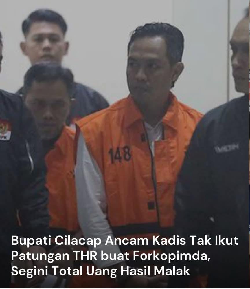 Bupati Cilacap Syamsul Auliya ditetapkan sebagai tersangka setelah terjaring OTT KPK terkait dugaan pemalakan dana THR dari para kepala dinas di lingkungan SKPD. Uang tersebut disebut akan dikumpulkan untuk diberikan kepada pihak eksternal dalam Forum Koordinasi Pimpinan Daerah (Forkopimda).