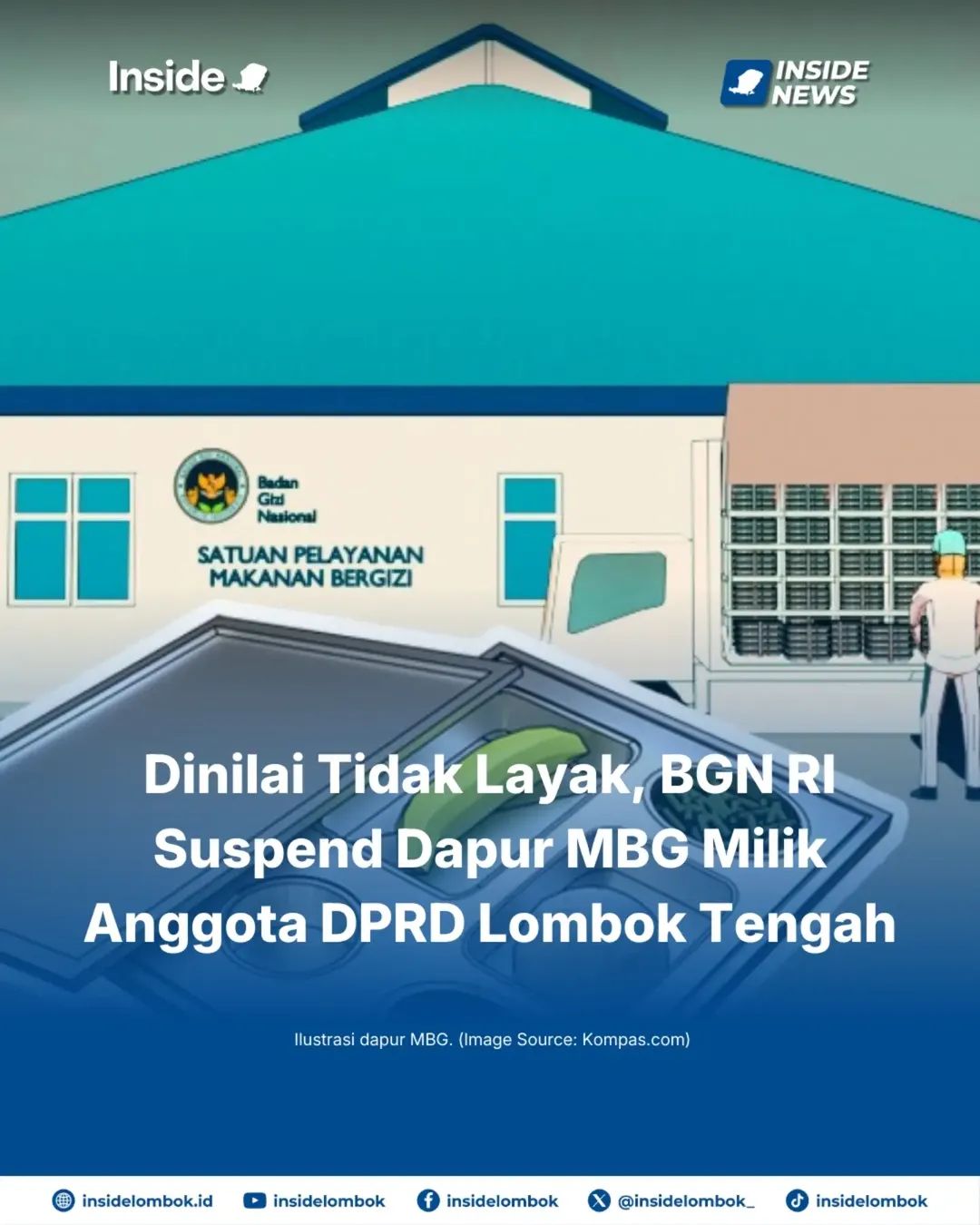 Badan Gizi Nasional (BGN) RI melakukan inspeksi mendadak (sidak) ke sejumlah dapur program Makan Bergizi Gratis (MBG) di Kabupaten Lombok Tengah. Dari hasil pemeriksaan, salah satu dapur milik anggota DPRD Lombok Tengah di Desa Bonder, Kecamatan Praya Barat, dinilai tidak layak beroperasi sehingga dikenakan suspend atau penutupan sementara.